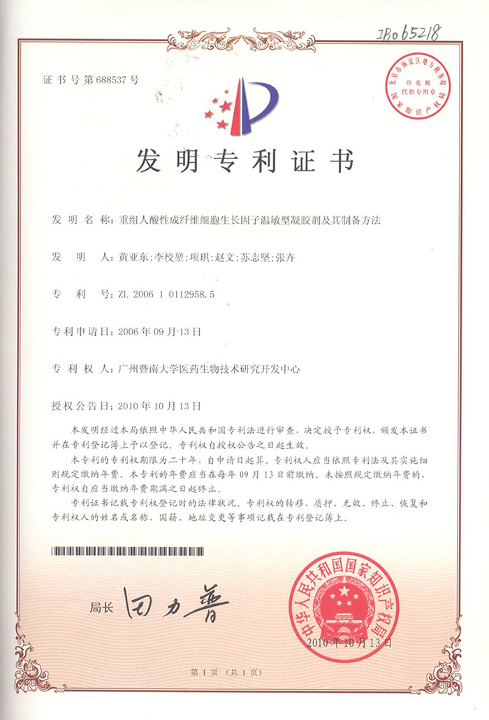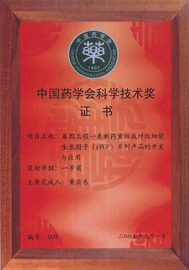 中國藥學(xué)會(huì)科學(xué)技術(shù)一等獎(jiǎng)-基因工程一類新藥重組成纖維細(xì)胞生長(zhǎng)因子(rFGF)系列產(chǎn)品的開發(fā)與應(yīng)用