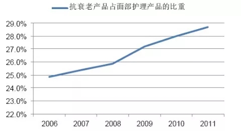 圖:2006-2011年抗衰老產(chǎn)品占面部產(chǎn)品比重