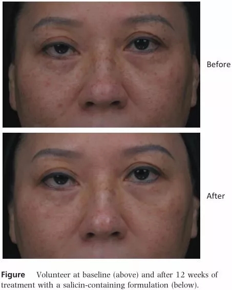 美國(guó)如新集團(tuán)的專家通過(guò)實(shí)驗(yàn)證實(shí)了水楊苷的抗衰老功效:受試者30名,為40歲至70歲的女性,每天潔面后涂抹含0.5%水楊苷的精華液,進(jìn)行為期12周的實(shí)驗(yàn)。