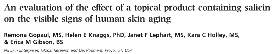 2、Remona Gopaul et al. An evaluation of the effect of a topical product containing salicin on the visible signs of human skin aging. Journal of Cosmetic Dermatology, 2010, 9, 196–201.
