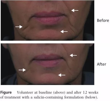 美國(guó)如新集團(tuán)的專家通過(guò)實(shí)驗(yàn)證實(shí)了水楊苷的抗衰老功效:受試者30名,為40歲至70歲的女性,每天潔面后涂抹含0.5%水楊苷的精華液,進(jìn)行為期12周的實(shí)驗(yàn)。